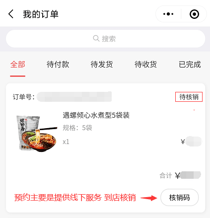 到店消費(fèi):用戶在小程序商城中下單提交后會(huì)在訂單中會(huì)出現(xiàn)“核銷碼”,到店時(shí)給對應(yīng)的核銷員進(jìn)行核銷操作即可。(核銷員需要在小程序商城管理后臺(tái)中設(shè)置,相關(guān)介紹“用戶管理-核銷員管理”)