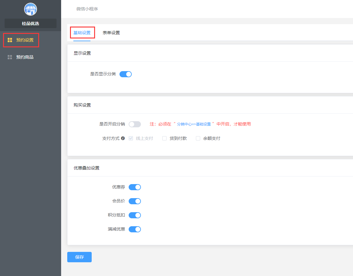 在基礎(chǔ)設(shè)置中包含顯示設(shè)置、購買設(shè)置、優(yōu)惠疊加設(shè)置。