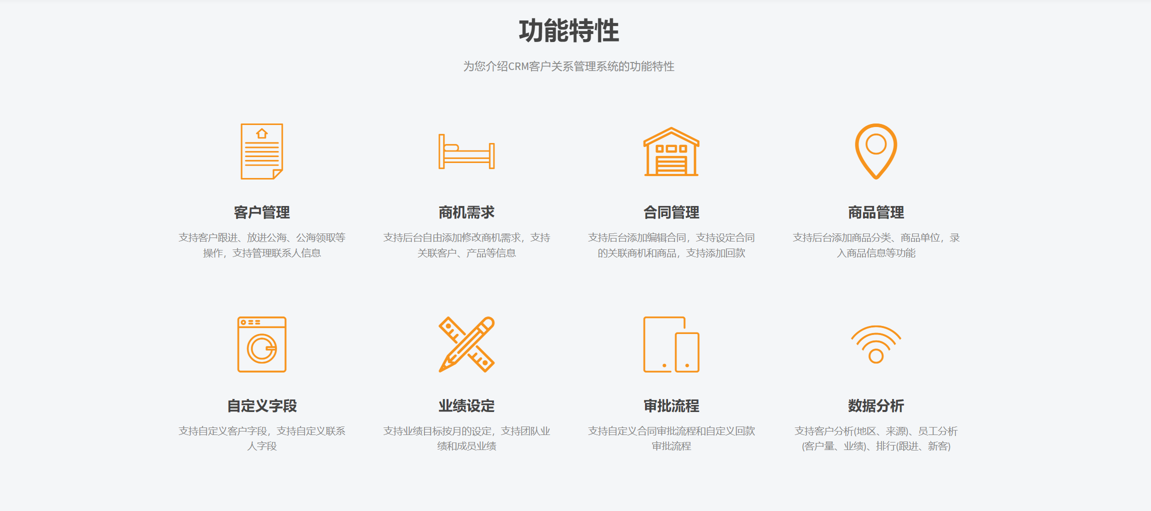 CRM客戶關(guān)系管理系統(tǒng),用于管理公司與當(dāng)前以及未來客戶之間的互動,支持客戶跟進全流程記錄、商機跟蹤、合同管理、業(yè)務(wù)團隊業(yè)績設(shè)定管理等